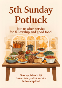 March Sunday 29 5th Sunday Potluck 11:00 am - 1:00 pm Every 5th Sunday we have our Potluck. Please join us! All are welcome Save the Date SHARE ON Twitter Facebook Buffer LinkedIn Pin It